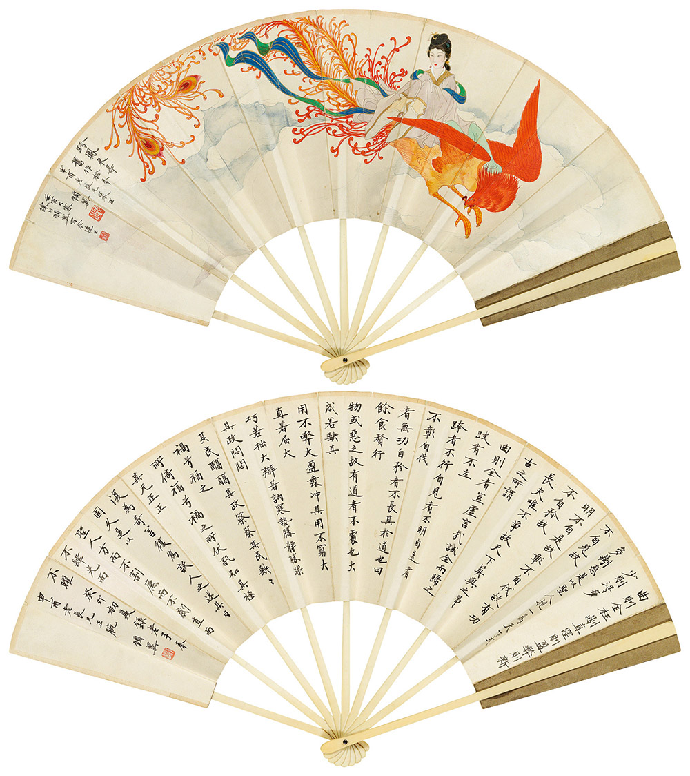 沪上顾翼,为大风堂入室弟子,天资聪颖,作山水、人物、花鸟皆精,深得大千赞赏。此柄《跨凤来寿·楷书节录〈老子〉》为顾氏临乃师《凤萧图》,原作仕女捧萧,跨凤腾云,其风取敦煌意。此柄照原作取镜像,省却萧管,只写采凤翩跹,仙姑飘然,敷色极得大千敦煌韵致,而开脸面容、体态形貌则与丰腴唐风有异,同中有异,可窥顾氏笔墨之思。