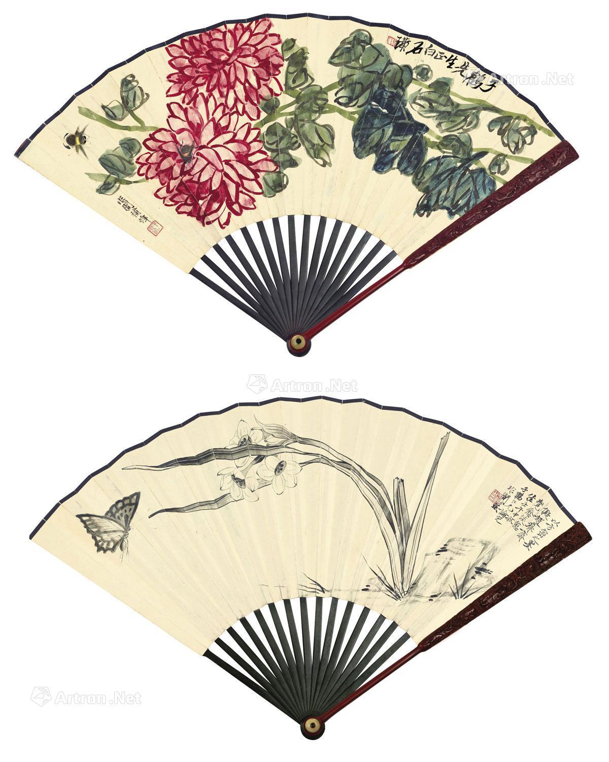 此扇乃齐白石、于非闇合作之精品,齐白石画红菊有于非闇补蜜蜂,其中一只占于花心作采粉状,颇具巧思,力显大师夺天工之妙。另面于非闇拟赵彝斋水仙蛱蝶图。上款:「子鹤」即黎子鹤( 1896-1960后),字世蘅,安徽当涂人。民国初年留学日本,于京都帝国大学研习经济。返国后,从事教育文化工作。故都陷敌后,他在一九三八年出任刚成立的北平女子师范学院院长。一九四二年又为北平代表之一,参加汪伪政府教育部在南京举行的全国教育会议。