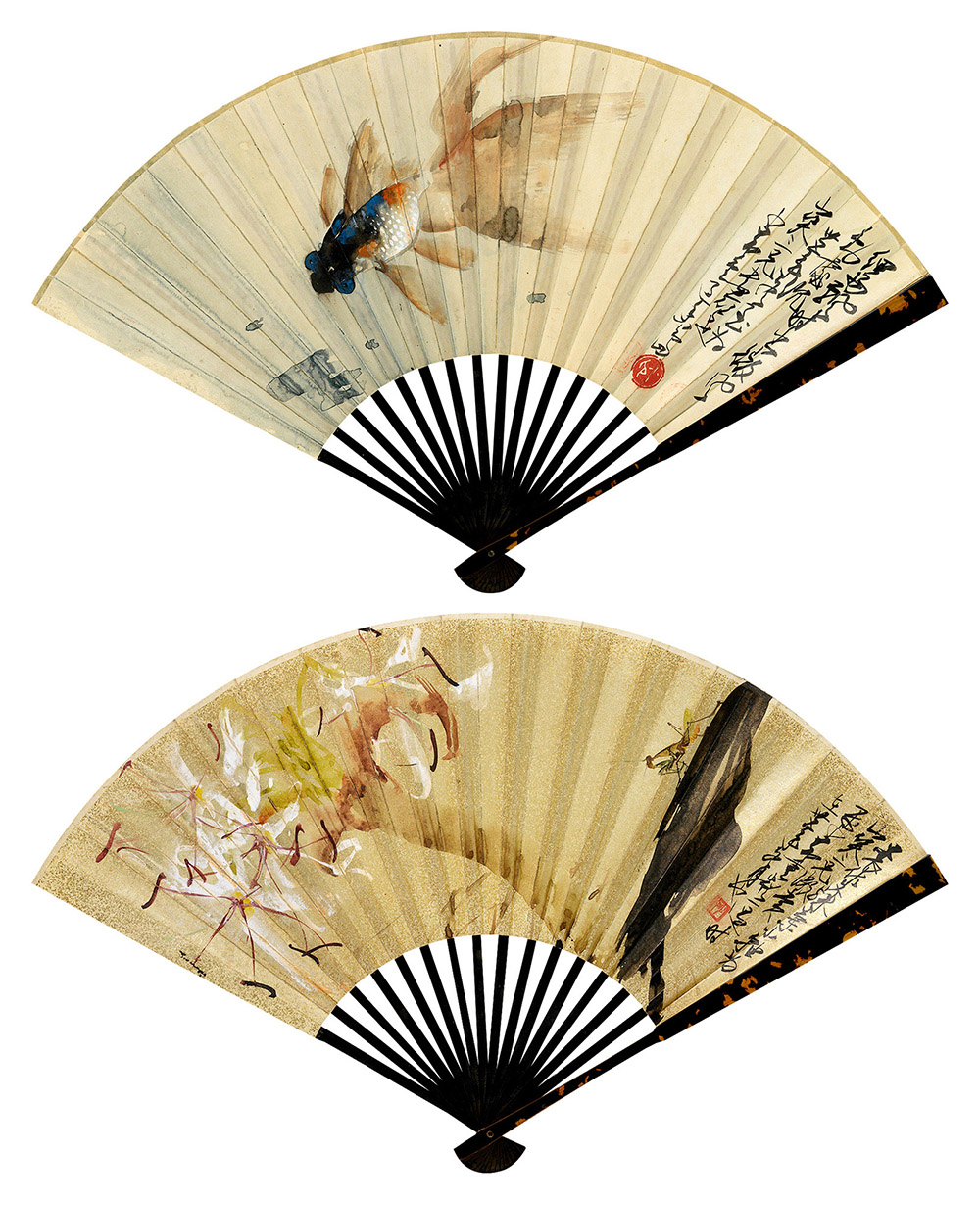 正 面:细雨飘时出,微风动处沉。卅五年冬至,为山笑三兄画箑。少昂重过香岛。