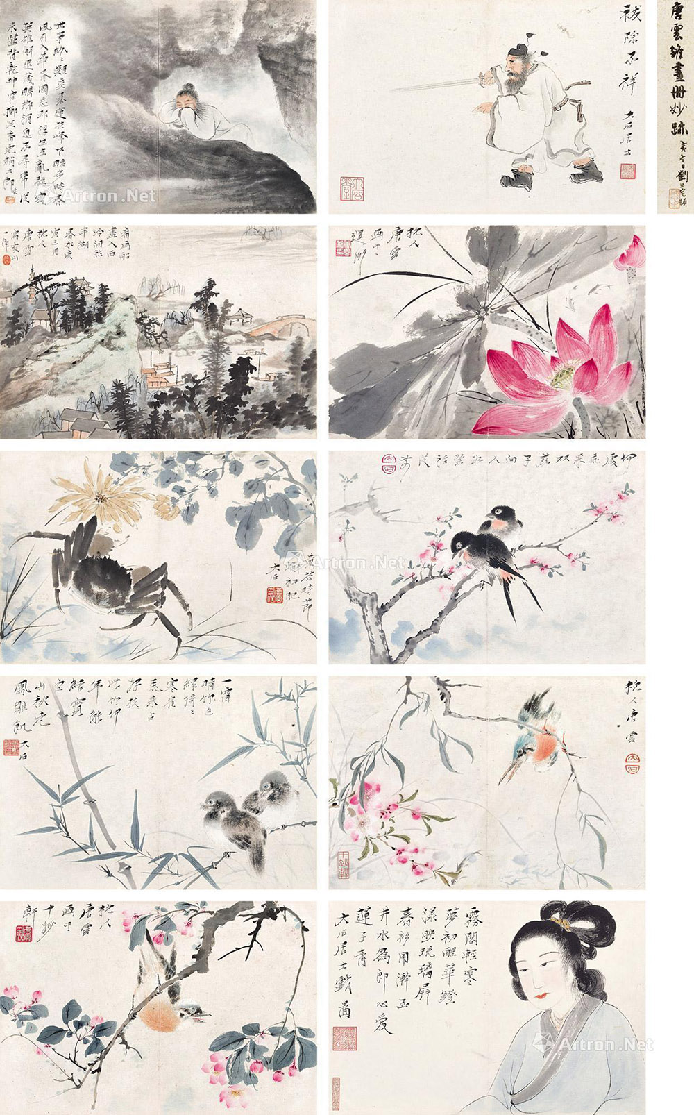是册十三开,分绘西湖、红荷、菊蟹、双燕、竹雀、翠鸟、桃枝幽禽、海棠白头、柳蝉、芍药、陈抟酣睡、祓除不祥、仕女图。其中山水一开、人物三开、花鸟九开,囊括画家各种创作题材,洵为难得。